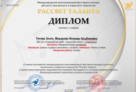 Образование: Высшее- НОЧУ ВО «Международный институт информатики, управления, экономики и права в г.Москве» (психолого-педагогическое образование)- 2024 г., среднее-специальное- Смоленское высшее училище-колледж им. М.В. Искавовского ( социально-культурная деятельность и народное художественное творчество)- 1995 г.